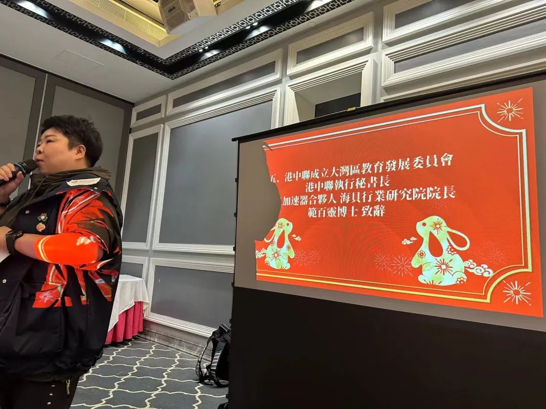 港中聯成立大灣區教育發展委員會,港中聯執行秘書長,海貝加速器合夥人,海貝行業研究院院長範百齡博士致辭:祝願大家新年快樂!在高朋滿座,朝氣蓬勃的時節,有新的期待!介紹了港中聯教育發展委員會的工作,連通港中聯內部系統發展與合作,多多互動溝通,提升港中聯專業影響力,專案引進,吸引海外人才,積極推動粵港澳大灣區,開展專業學術論壇,優秀人才的互動,講好大灣區的故事,講好香港故事。推動學術教育,職業教育,建立碩士工作站、博士工作站、博士後工作站、推出一系列的高校合作。建立一所職業化大學,一個綜合性教育平台。